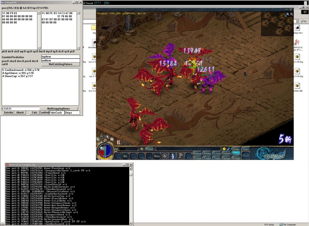At the end of high-school I decided to skip my prom and focus on creating my own wsock32.dll wrapper which allowed me to intercept data between the Conquer Online client and the Conquer Online server. While initially the data was encrypted I was able to use a live assembly debugger (as I had no symbols) to find and reverse engineer the encryption/decryption algorithm. This allowed me to modify and intercept data that usually would not be exposed to the player.